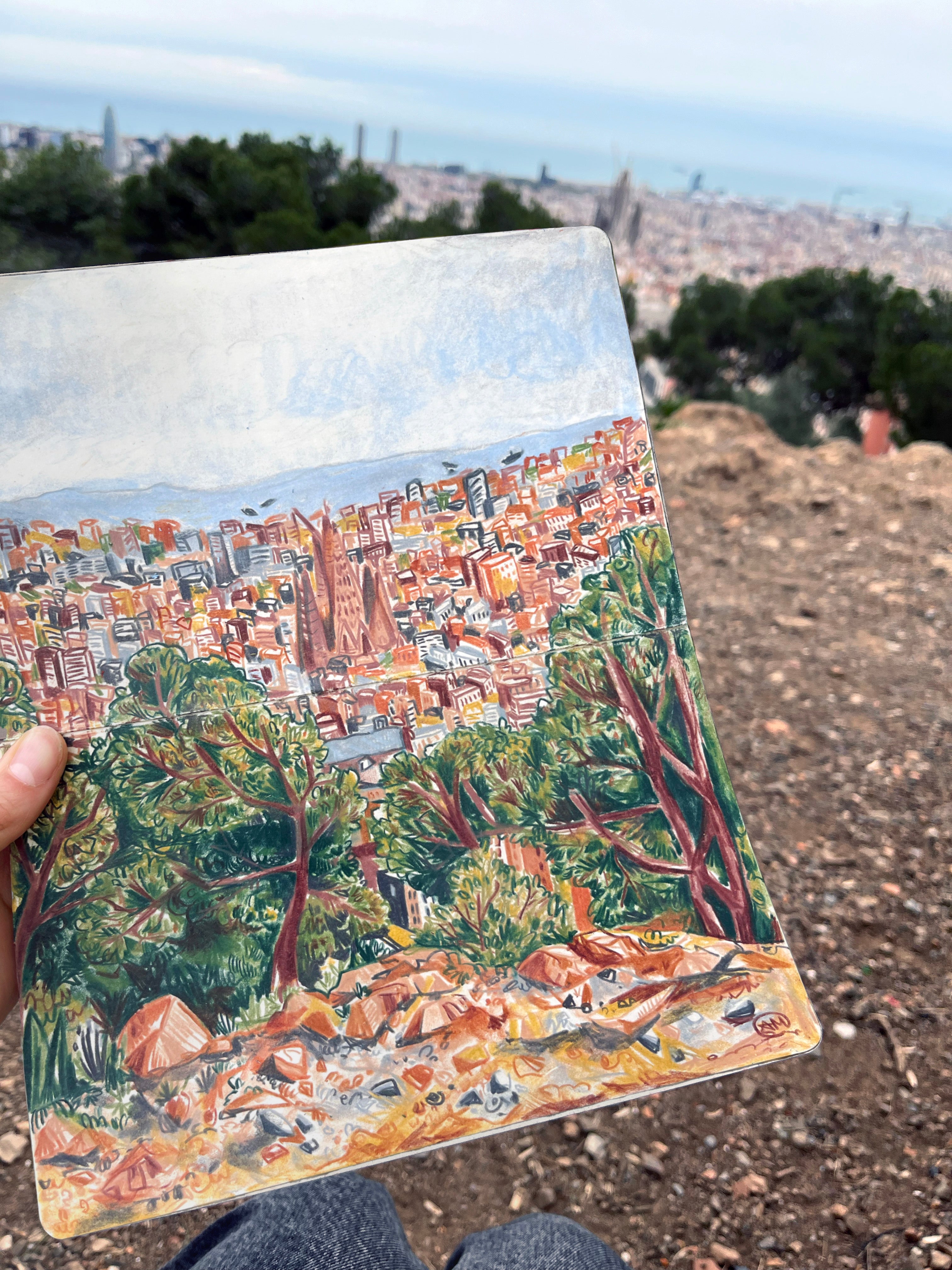 Drawing is at the heart of her practice, so you will often find her sketching on location, bringing her sketchbook with her wherever she goes.