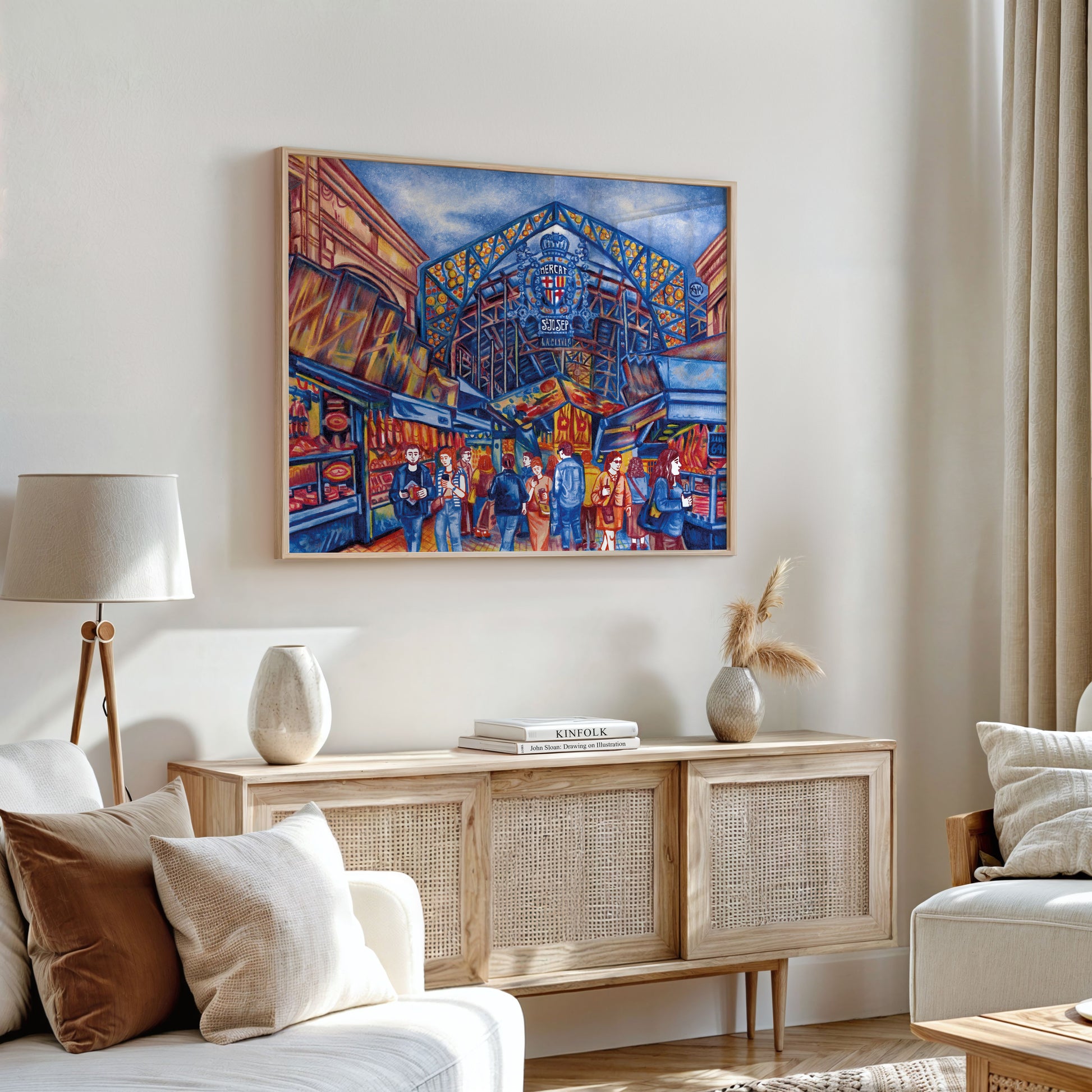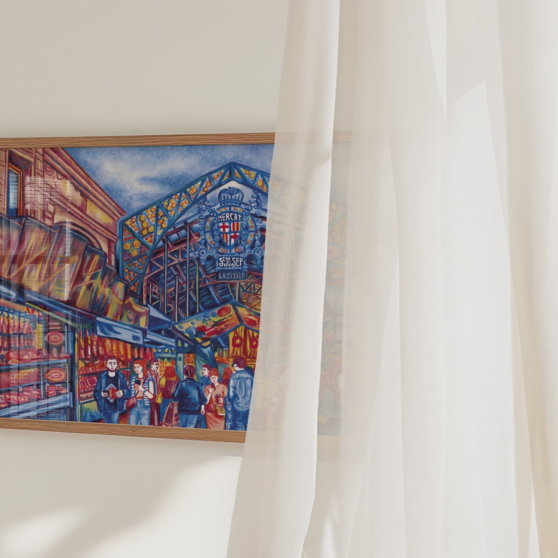 Step into the heart of Barcelona’s most iconic market with this vibrant original artwork by illustrator Alice Mawdsley. Drawn on location at Mercat de Sant Josep de la Boqueria, this 15 x 20 cm piece captures the rich colour, energy, and architectural detail of the bustling food stalls and Gothic structure.